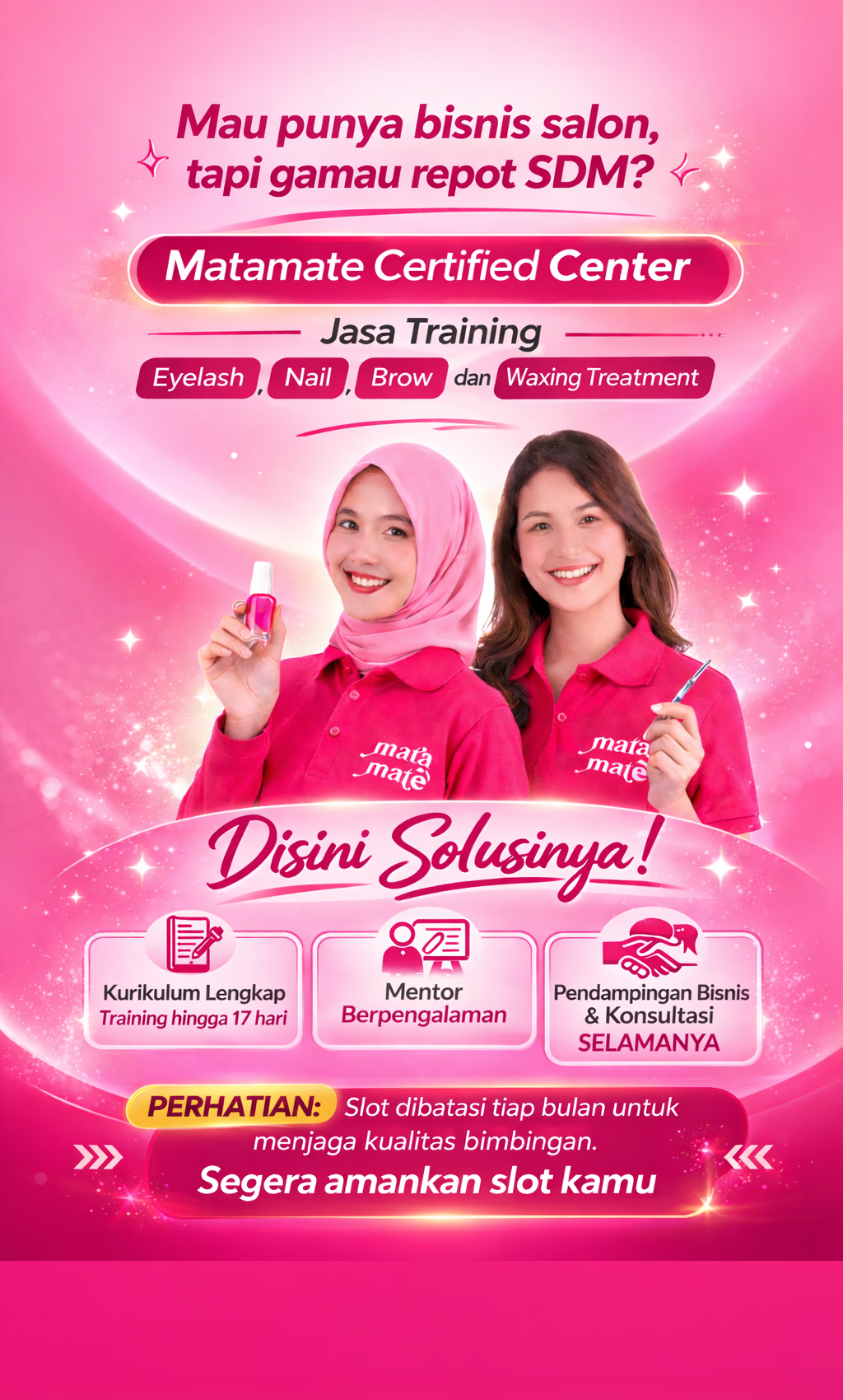 Training di Matamate sangat lengkap! Sekarang saya sudah punya salon sendiri dengan karyawan yang kompeten. Terima kasih Matamate!
